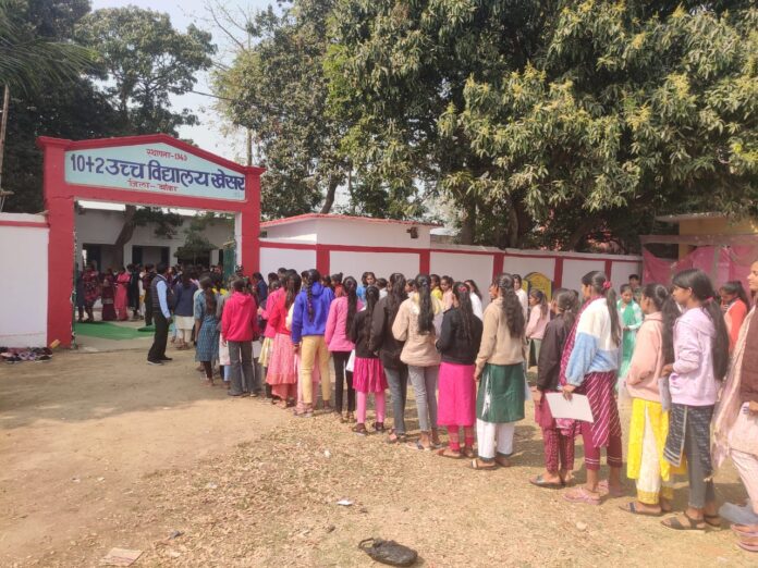बिहार/बाँका। प्रखंड के अंतर्गत प्लस टू उच्च विद्यालय खेसर एवं एवं प्लस उच्च विद्यालय बालादेव ईटहरी फुल्लीडुमर मैं सोमवार को परीक्षा प्रारंभ दंडाधिकारियों पुलिस पदाधिकारी एवं गस्ती दंडाधिकारी के मौजूदगी में प्रारंभ की गई पहले सेटिंग में प्लस उच्च विद्यालय खेसर हिंदी परीक्षा में कल 637 छात्र में से सात अनुपस्थित बताए गए।