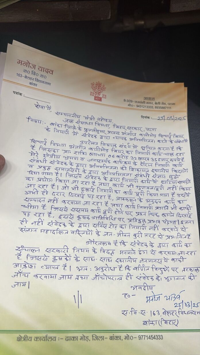 बिहार/बाँका। बांका जिले के फूललीडुमर प्रखंड अंतर्गत दो प्रखंडों के सीमा पर बन रहे कानीमोह वियर को लेकर क्षेत्रीय विधायक मनोज यादव से किसानों के द्वारा संवेदक द्वारा सही कार्य नहीं करने को लेकर विधायक से किया शिकायत किसानों ने यह भी बताया कि वर्षों से कानीमोह वियर विभागीय लापरवाही के कारण मृत पड़ा हुआ था बरसों से जनप्रतिनिधियों से शिकायत करने पर 6 करोड़ 32 लाख 35 हजार के लागत से या बियर का निर्माण क्षेत्रीय विधायक मनोज यादव के प्रयास से कराया जा रहा है लेकिन विभाग में बैठे आला अधिकारियों की मनमानी संवेदक का लापरवाही से करोड रुपए के लागत से बनने वाली यह वियर समय के पूर्व क्षतिग्रस्त होकर बिखर जाएगा स्थानीय लोगों ने विधायक से लिखित में शिकायत की है कि इस कार्य पर शीघ्र ध्यान दिया जाए विधायक मनोज यादव ने इस संबंध में जल संसाधन विभाग के बिहार सरकार के मंत्री को अपने लेटर पैड पर लिखते हुए शिकायत दर्ज कराई है विधायक द्वारा लिखा गया है कि कानी मोह वियर में जो संवेदक द्वारा कार्य कराया जा रहा है उसमे घोर लापरवाही बढ़ती जा रही है गुणवत्ता पूर्ण कार्य नहीं होने से ढलाई की गई कई जगहों पर दरारें आ गई है प्राक्कलन के अनुसार गुणवत्तापूर्ण कार्य नहीं किया जा रहा है संवेदक द्वारा नियमों का उल्लंघन किया जा रहा है और स्थानीय किसानों के बातों को नजर अंदाज करते हुए अपनी मनमानी तरीके से कार्य कर रहे हैं सूत्रों के जानकारी के अनुसार संवेदक द्वारा एक दूसरे को कहा जा रहा है कि कार्यस्थल पर कोई भी व्यक्ति किसी तरह का व्यवधान पैदा करते हैं तो उसके विरुद्ध प्राथमिक की दर्ज कराई जाएगी जिससे स्थानीय किसान सा में हुए हैं इसका भाई दिखाकर संवेदक अपनी मनमानी तरीके से कार्य कर रहे हैं इस संबंध में जब जल संसाधन विभाग बिजी खरवा के अवर प्रमंडल पदाधिकारी अरुण कुमार से जानकारी ली गई उन्होंने साफ शब्दों में कहा की कार्य गुणवत्ता पूर्ण हो रही है कहीं किसी तरह की त्रुटि कार्यों में नहीं है।