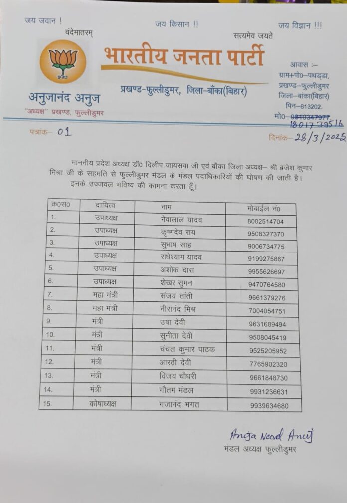 बिहार/बाँका। प्रखंड भाजपा मंडल अध्यक्ष अनुजा नंद अनुज के अध्यक्षता में प्रखंड मंडल कमेटि का विस्तार करते हुए उपाध्यक्ष के रुप में (1) नेवालाल यादव मोबाइल नंबर 800 251 4704 (2) कृष्णदेव राय मोबाइल 9508327370 (3) सुभाष शाह मोबाइल नंबर 90 067 347 75 (4) राधेश्याम यादव मोबाइल नंबर 91 99 27 5867 (5) अशोक दास मोबाइल नंबर 9955 62 6697 (6) शेखर सुमन मोबाइल नंबर 9470 76 4580 महामंत्री के रुप में (1) संजय तांती 9661 37 9276 (2) नीरानंद मिश्र 70040 5 4751 मंत्री के रूप में (1) उषा देवी 96 3168 9494 (2) सुनीता देवी 95080 45419 (3) चंचल कुमार पाठक 952520 5952 (3) आरती देवी 7765 90 23 20 (4) विजय चौधरी 966184 8730 (5) गौतम मंडल 99 31236631 (6) गजानंद भक्त 9939 63 4680 इन तमाम लोगों का नाम प्रखंड कमेटी में विस्तार करने पर पार्टी के प्रदेश अध्यक्ष डाक्टर दिलीप जायसवाल जिलाध्यक्ष ब्रजेश कुमार मिश्रा एवं भाजपा नेता कुणाल भगत ने कहा है की प्रखंड मंडल कमेटी विस्तार को लेकर प्रखंड मंडल अध्यक्ष के साथ साथ प्रखंड मंडल कमीटी के सभी सदस्यों को बधाई देते हुए सभी के उज्जवल भविष्य की कामनाओ के साथ पार्टी संगठन को मजबूत करने का भी दायित्व देता हूं।