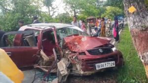 बेतिया/वाल्मीकिनगर। वाल्मीकिनगर भ्रमण से लौट रहे पर्यटकों की कार नौरंगिया एवं हरदियाचांटी के बीच मलंगवा पुलिया के पास अनियंत्रित होकर पेड़ से जा टकराई।जिसमें कार सवार चालक समेत सभी पर्यटक गंभीर रूप से जख्मी हो गए। इस बाबत थानाध्यक्ष अजय कुमार ने बताया कि कार पेड़ से टकराने के बाद कार का दरवाजा लॉक हो गया था।