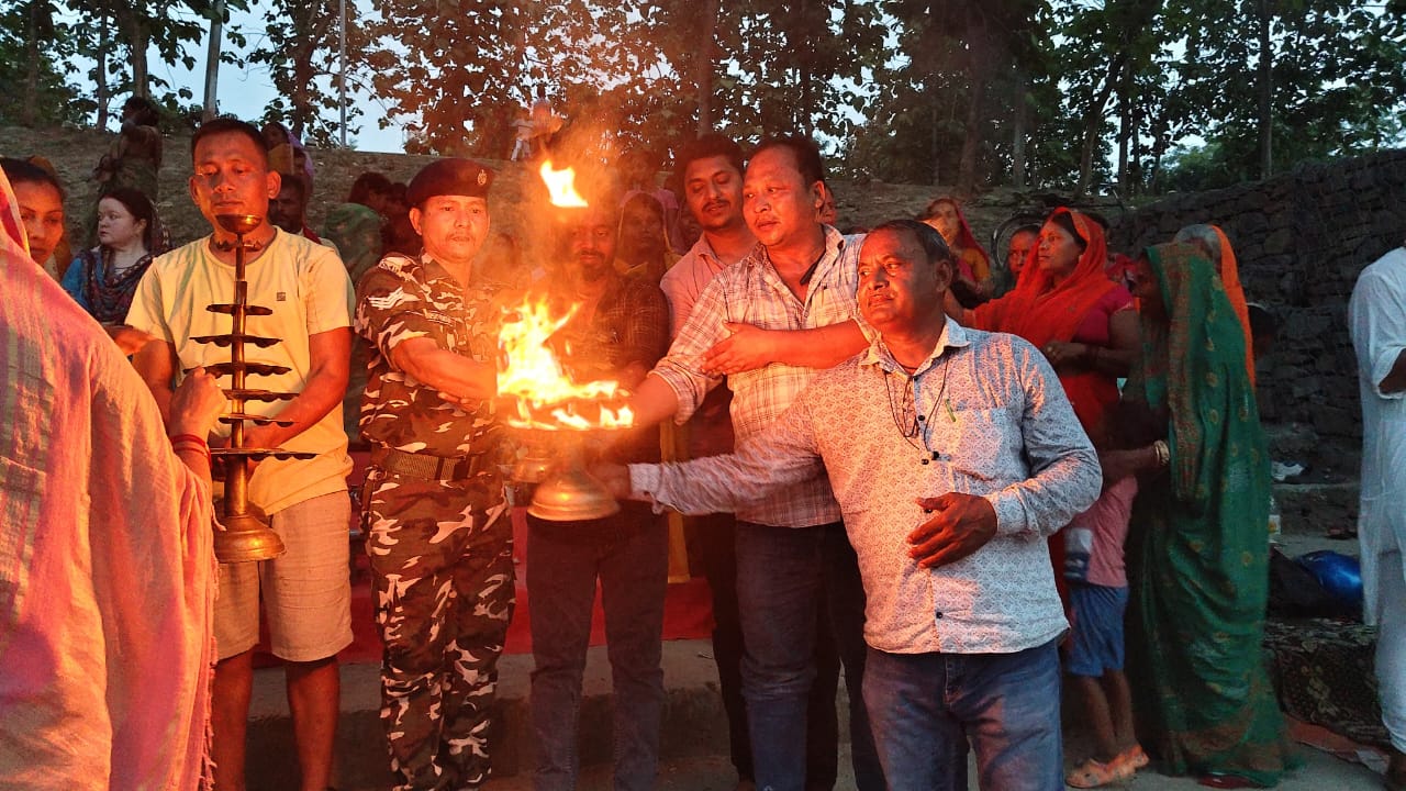 बेतिया/वाल्मीकि नगर। भारत नेपाल सीमा पर अवस्थित बेलवा घाट परिसर में ज्येष्ठ पूर्णिमा के अवसर पर 143 वीं नारायणी गंडकी महाआरती कार्यक्रम का आयोजन किया गया। अंतर्राष्ट्रीय न्यास स्वरांजलि सेवा संस्थान द्वारा आयोजित इस कार्यक्रम का शुभारंभ मुख्य अतिथि ग्राम पंचायत राज जिमरी नौतनवां के मुखिया खूबलाल बड़घडिया, विशिष्ट अतिथि निर्माता एचेल थारू,सम्मानित अतिथि सत्येंद्र सिंह, सुमन देवी, फाइटर जयदेव कुमार, सशस्त्र सीमा बल के त्रिदेव प्रसाद ,गायक शिवचंद्र शर्मा, स्वास्थ्यकर्मी कुमारी संगीता , गायक बालकृष्ण प्रसाद, कीर्तनकार चंदू खतइत, अभिनेता सोनू चौधरी एवं कामेश्वर श्रीवास्तव ने संयुक्त रूप से दीप प्रज्वलित करके किया। मुख्य अतिथि खूबलाल ने कहा कि अब यह महा आरती इस स्थल की पहचान बनती जा रही है। अब तक इस मंच द्वारा हजारों पौधों का वितरण किया जा चुका है।विशिष्ट अतिथि निर्माता एचेल थारू ने कहा कि नारायणी नदी का इतिहास अति प्राचीन है। फाइटर जयदेव कुमार ने कहा कि लड़के लड़कियों को आत्मरक्षा के लिए मैं जूडो कराटे की ट्रेनिंग देता हूं, मेरे ऐसे लोगों के लिए महा आरती एक बड़ा प्लेटफार्म साबित हो रहा है। यूट्यूबर सोनू चौधरी ने कहा कि संस्था द्वारा पर्यावरण संरक्षण एवं संवर्धन के प्रति जन जागरूकता फैलाई जा रही है।