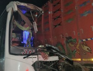 जय माता दी बस ने खड़ी ट्रक में मारी टक्कर, 56 यात्री जख्मी, इलाज जारी।
