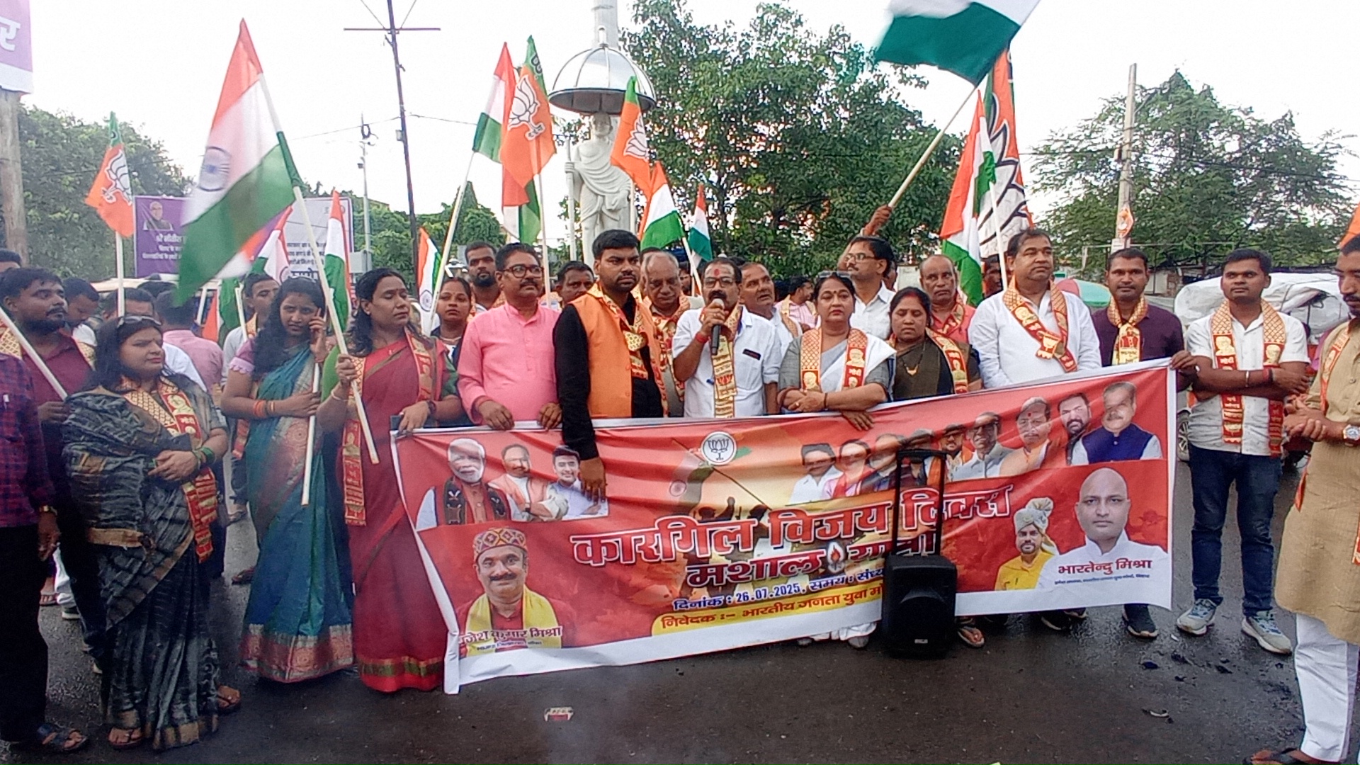 बांका/नगर। भारतीय जनता युवा मोर्चा ने कारगिल विजय दिवस का 27वें वर्षगांठ पर माशाल जुलूस निकाला। मशाल जुलूस की शुरुआत आर एम के मैदान से वन्दे मातरम, वीर शहीद अमर रहे जैसे उद्घोष के साथ किया गया, जिसमें दर्जनों की संख्या में भारतीय युवा मोर्चा के कार्यकर्ता मौजूद थे। इस मौक़े पर बेलहर विधानसभा केप्रत्याशी मनोज यादव ने कहा कि, हमारे वीर शहीद जिन्होंने अपने प्राणों से आगे हमारे देश को रखा उन्हें मैं नमन करता हूँ। जिस प्रकार यह जुलूस निकाला गया उसके लिए मैं जिला के भारतीय जनता युवा मोर्चा के तमाम साथियों को क्रन्तिकारी सलाम करता हूँ। वहीं वणिज्य प्रकोष्ठ भाजपा के जिलाध्यक्ष अनुपम गर्ग ने कहा कि, आज से 26 वर्ष पूर्व हमारे देश के वीर नायकों ने पाकिस्तानी सैनिकों के छक्के छुड़ा कर देश का मान बढ़ाया वो वाजिब में सम्मान के हक़दार हैं। तत्कालीन प्रधानमन्त्री श्रद्धेय अटलजी के इस कार्य को हम हमेशा याद रखेंगे। नगर परिषद उपसभापति डा.विनीता प्रसाद ने कहा कि, जिस प्रकार कार्यक्रम में युवाओं ने भागीदारी ली इससे यह साबित होता है कि युवाओ में देशभक्ति कितना चरम पर है। आशा करती हूँ कि आगे भी हम अपने जवानो के सम्मान में हमेशा श्रद्धा सुमन अर्पण करेंगे। इस अवसर पर युवा मोर्चा के जिलाध्यक्ष रंजीत यादव, सहित दर्जनों लोग मौजूद थे।