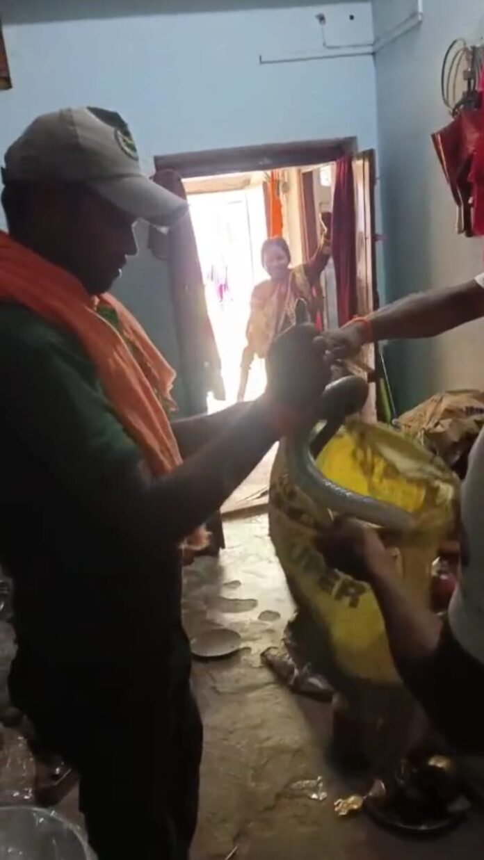 बेतिया/वाल्मीकिनगर। टंकी बाजार स्थित एक बर्तन की दुकान में दो सांपों के घुस जाने से अफरातफरी मच गई। बताते चलें कि टंकी बाजार स्थित आत्मा कुमार के बर्तन की दुकान है,इसी दुकान के ऊपरी तल्ले पर ये परिवार के साथ निवास रहते हैं। शनिवार को अचानक दो सांपों को दुकान में घुसे देख अफरातफरी मच गई।रेंजर अमित कुमार को इसकी सूचना दी गई।रेस्क्यू टीम सुनील कुमार के नेतृत्व में एक सांप को रेस्क्यू करने में कामयाब रही लेकिन एक सांप आपाधापी के बीच वहां से भाग निकला और समीप के झाड़ियों में गायब हो गया। इस बाबत रेंजर अमित कुमार ने बताया कि ऐसे हालत में सांपों से दूरी बनाकर रहें और वन विभाग को तुरंत सूचित करें।