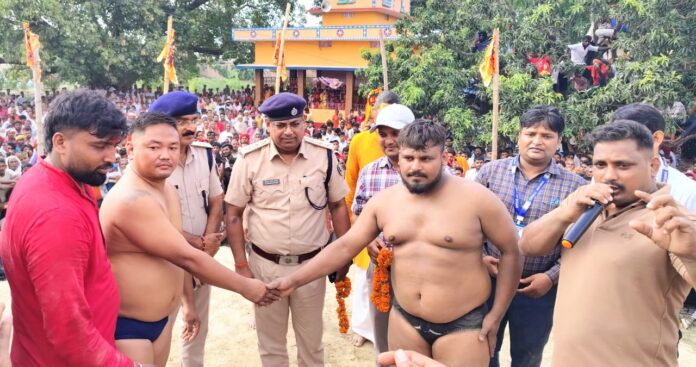 बेतिया/मझौलिया। मझौलिया प्रखंड क्षेत्र के करमवा पंचायत भवन परिसर में नाग पंचमी के अवसर पर कुश्ती महा दंगल का आयोजन किया गया। जिसमें बिहार , नेपाल , उत्तर प्रदेश , राजस्थान के महिला एवं पुरूष पहलवानों ने कुश्ती का दमखम दिखाया । मौके पर आयोजक अध्यक्ष दसरथ प्रसाद ने बताया कि दंगल कुश्ती एक प्राचीन परंपरा है जिसमें शारीरिक शक्ति और दमखम दिखाया जाता है। लुप्त होती परंपरा को जीवित रखा जा रहा है। कुश्ती में पहलवानों द्वारा दाव पेच दिखाते हुए अपना दम कम दिखाया जाता है। कुश्ती का खेल जोश और उमंग पैदा करता है।