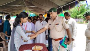 पंक्तिबद्ध खड़े देश के जवानों को छात्र छात्राओं ने राखी बांध आशीर्वाद प्राप्त किया। इंस्पेक्टर अवधेश कुमार ने बताया कि बार्डर पर तैनात सुरक्षा कर्मी समाज सहित बहनों की सुरक्षा पर आंच नहीं आने देंगे।हम आप सबकी सुरक्षा के लिए सदैव तत्पर है।