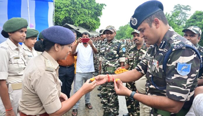 बेतिया/वाल्मीकिनगर। SSB 21वीं वाहिनी बगहा अधीन सीमा चौकी गंडक बैराज में तपेश्वर संबित राउत, (कमान्डेंट )के उपस्थिति में भाई – बहन के पवित्र प्रेम स्नेह और रक्षा के वचन का प्रतीक रक्षाबंधन का त्यौहार हर्षोल्लास के साथ मनाया गया l इस अवसर पर बहनों ने सैनिक भाइयों के कलाई में राखी बांधी। प्रेम में पिरोया रक्षा सूत्र बांधकर पारंपरिक तरीके से देश की सुरक्षा के बचन की प्रतिबद्धता को याद दिलाया। इस अवसर पर कमांडेंट तपेश्वर संबित राउत ने कहा कि लोक परंपराओं को संरक्षित करने जनसरोकारों में अपनी प्रत्यक्ष भागीदारी की जिम्मेदारी सुनिश्चित करने वाली बहनों तथा सीमा को सुरक्षित रखने वाले सैनिकों के साथ पूरा देश भावनात्मक रूप से रक्षा सूत्र बंधन उत्सव के माध्यम से जुड़ा है।