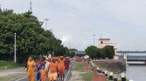 गंडक बराज नियंत्रण कक्ष परिसर में बोल बम की जय घोष के साथ संगम में डुबकी लगाने पहुंचे शिव भक्त