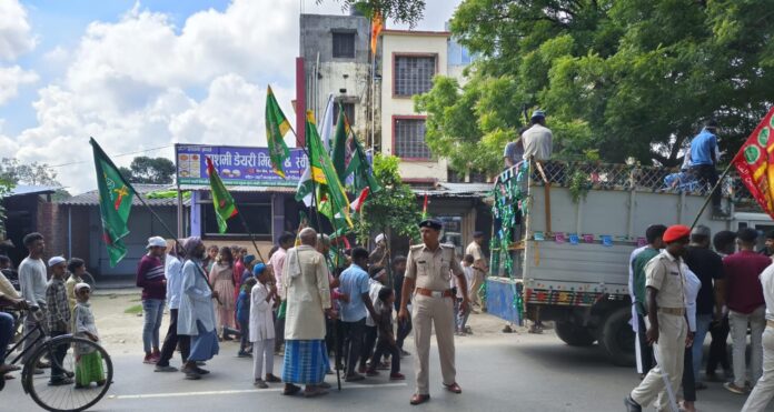 बेतिया/वाल्मीकिनगर। वाल्मीकि नगर में रहने वाले मुस्लिम समुदाय के लोगों द्वारा शनिवार की सुबह मोहम्मद साहब के जन्मदिन के अवसर पर खुशी इजहार करने के लिए जुलूस निकाला गया। यह जुलूस वाल्मीकिनगर के विजयपुर से चलकर गोल चौक होते हुए टंकी बाजार में समाप्त हुआ। इस जुलूस में मुस्लिम समुदाय के सैकड़ो लोग शामिल हुए थे। जुलूस के बाबत जानकारी देते हुए विजयपुर मस्जिद के इमाम मोहम्मद नेयाज ने बताया कि मोहम्मद साहब का जन्म 570 ई में हुआ था। इनके पिता का नाम अब्दुल्लाह और माता का नाम अमीना था। उनके जन्मदिन को रबी अल अव्वल इस्लामिक कैलेंडर के अनुसार मनाया जाता है। मुस्लिम समुदाय के द्वारा निकाली गई जुलूस पुलिस प्रशासन के निगरानी मे थी। थानाध्यक्ष मुकेश चंद्र कुमार ने बताया कि जुलूस के दौरान किसी प्रकार का हुड़दंग ना हो, इसके लिए प्रशासन सतर्क था। शांतिपूर्ण माहौल में जुलूस संपन्न हो गया। इसमें सभी समुदाय के लोगों का सहयोग मिला।