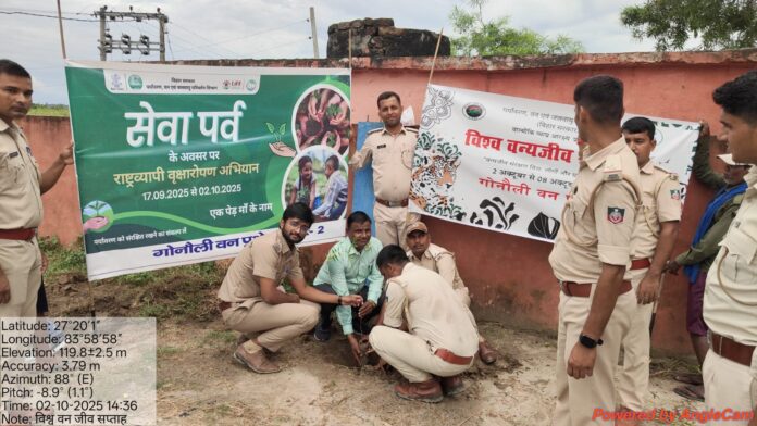 बेतिया/वाल्मीकिनगर:- थाना क्षेत्र के गोनौली रेंज में वन विभाग द्वारा ‘सेवा पर्व-पखवाड़ा’ अभियान के तहत एक बृहद पौधरोपण कार्यक्रम का आयोजन किया गया। यह पौधारोपण कार्यक्रम रेंजर राजकुमार पासवान के निर्देशन में किया गया।रेंजर ने अपने संबोधन में वृक्षों को जीवन का अभिन्न अंग बताया। उन्होंने कहा कि हर साल प्राकृतिक आपदाओं में बड़ी संख्या में पेड़ नष्ट हो जाते हैं, इसलिए हमें धरती को हरा-भरा रखने और प्राकृतिक संतुलन बनाए रखने के लिए अधिक से अधिक पौधे लगाने का संकल्प लेना चाहिए।