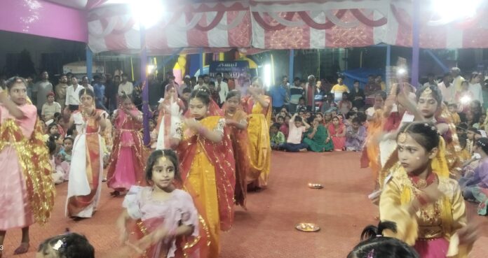 बेतिया/वाल्मीकिनगर:- थाना क्षेत्र के भेड़िहारी कालोनी स्थित उत्क्रमित माध्यमिक विद्यालय परिसर में शारदीय नवरात्र के उपलक्ष्य में बंगाली व आदिवासी समाज के छात्र-छात्राओं ने मनमोहक सांस्कृतिक कार्यक्रम के तहत नृत्य व संगीत की प्रस्तुति की। इस अवसर पर केंद्रीय कोयला एवं खान मंत्री सतीश चंद्र दुबे व वाल्मीकिनगर विधायक धीरेंद्र प्रताप सिंह भी उपस्थित रहे। पूजा समिति के अध्यक्ष तापोश टैगोर ने बताया कि प्रत्येक साल शारदीय नवरात्र में सांस्कृतिक कार्यक्रम का आयोजन किया जाता है। इस साल सांस्कृतिक कार्यक्रम का अलग रूप दिया गया था। जिसमें गीत संगीत के साथ नृत्य की प्रस्तुति की गई । पिछले साल केवल रिकॉर्डिंग नृत्य का प्रस्तुतिकरण किया गया था। इस साल छात्र-छात्राओं को अपनी आवाज में गीत प्रस्तुति का अवसर प्रदान किया गया ।