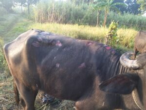 बेतिया/वाल्मीकिनगर:- थाना क्षेत्र के लक्ष्मीपुर रमपुरवा पंचायत के झंडू टोला गांव में रविवार की रात मनोज राम के दो पशु घरों में आग लगने से दो घर जलकर राख हो गया, साथ ही आग के चपेट में आने से चार भैंसें भी झुलस गई। जिस समय यह घटना घटी झंडू टोला के ग्रामीण सोए हुए थे। आग की लपटों को देखकर पड़ोसी द्वारा शोर मचाया गया। जब तक ग्रामीण इकट्ठे होते, तब तक बहुत देर हो चुकी थी दो घर स्वाहा हो चुका था। किसी तरह आग की चपेट में आए घर में बांधी गई चार भैंसों को ग्रामीणों द्वारा बाहर निकाला गया, लेकिन भैंसें भी झुलस गई थी। जली हुई भैंसों के इलाज के लिए पशुपालक एवं ग्रामीणों के द्वारा पशु चिकित्सक को बुलाने की प्रक्रिया शुरू हो गई थी। पशुपालक मनोज राम ने बताया कि घर में रखे 50 किलो गेहूं सहित चावल कपड़े भी जल गए हैं। खाने के लिए अग्नि देव ने कुछ भी नहीं छोड़ा है।