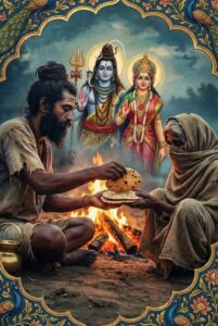 परीक्षा की घड़ी ,महादेव के आदेश पर, माँ पार्वती एक बूढ़ी भिखारिन का वेष धरकर उस भक्त के पास पहुँचीं और दीन भाव से बोलीं, “बेटा, कई दिन से भूखी हूँ, क्या मुझे कुछ खाने को दोगे?”