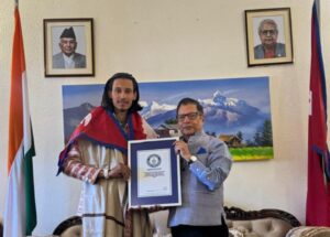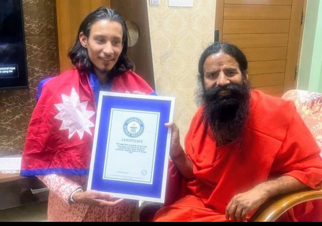 बेतिया/वाल्मीकिनगर :- सीमावर्ती नेपाल के महलवारी निवासी प्रसिद्ध आध्यात्मिक संत एवं अंतर्राष्ट्रीय न्यास स्वरांजलि सेवा संस्थान के धर्मगुरु धर्मपाल गुरु वशिष्ठ जी महाराज के प्रिय शिष्य विजयशाही ने गिनीज वर्ल्ड रिकॉर्ड्स में अपना नाम दर्ज कराया है। इस खबर से वाल्मीकिनगर एवं सीमावर्ती नेपाल के लोगों में खुशी की लहर दौड़ गई है। विदित हो कि भारत में नेपाल के राजदूत डॉ. शंकर पी. शर्मा ने नेपाल के कालीकोट निवासी विजय शाही को योग में गिनीज वर्ल्ड रिकॉर्ड का प्रमाण पत्र प्राप्त करने पर भारत स्थित नेपाल दूतावास में सम्मानित किया। विजय शाही ने लगातार 27 मिनट 3 सेकंड तक ऊर्ध्व पद्मासन (अपवार्ड लोटस पोज) धारण कर यह रिकॉर्ड स्थापित किया। इस उपलब्धि के माध्यम से उन्होंने असाधारण शारीरिक सहनशक्ति और मानसिक अनुशासन का प्रदर्शन किया। उनकी इस उपलब्धि पर बधाई देते हुए राजदूत शर्मा ने शाही की समर्पण भावना की सराहना की, और कहा कि यह उपलब्धि नेपाल के लिए गर्व का विषय है। साथ ही यह योग और वैलनेस के देश की समृद्ध परंपरा को भी उजागर करती है। इस उपलब्धि के साथ उन्होंने पूर्व में आकाश बागेपली द्वारा बनाए गए 20 मिनट 36 सेकंड के रिकॉर्ड को तोड़ दिया। विजयशाही की असाधारण सफलता पर पतंजलि के योग गुरु स्वामी रामदेव बाबा एवं आचार्य बालकृष्ण ने भी उन्हें विशेष रूप से सम्मानित करते हुए बधाइयां दी है। योग एवं साधना के क्षेत्र में उनकी अंतरराष्ट्रीय उपलब्धि की चारों ओर प्रशंसा हो रही है। विजय शाही के गुरु एवं मार्गदर्शक धर्मपाल गुरु वशिष्ठ जी महाराज ने बताया कि विजयशाही के भीतर एक दिव्य अलौकिक प्रतिभा विद्यमान है ।आगे उन्होंने बताया कि विजयशाही किसी भी पुस्तक को मात्र 5 मिनट तक अवलोकन करने के बाद पुस्तक बंद करके भी उसमें लिखित समस्त विषय वस्तु को सटीक रूप से बता सकते हैं ,जो उनकी असाधारण स्मरण शक्ति और साधना का प्रमाण है। गौरतलब है कि इसी वर्ष नारायणी गंडकी महा आरती कार्यक्रम में विजयशाही को उनकी योग साधना और अंतरराष्ट्रीय उपलब्धि के लिए नारायणी गंडकी सम्मान से भी सम्मानित किया जाएगा। दूरभाष पर विजय शाही ने बताया कि भारत के गायक और स्वरांजलि सेवा संस्थान के संस्थापक डी.आनंद ने भी लगातार हमारी साधना को प्रोत्साहित करने का काम किया है। नारायणी गंडकी महाआरती में भी हमारी सफलता हेतु प्रार्थना की जाती रही है। यह सम्मान न केवल विजयशाही की साधना का बल्कि भारत नेपाल की साझा आध्यात्मिक परंपरा और योग संस्कृति का भी प्रतीक होगा।