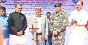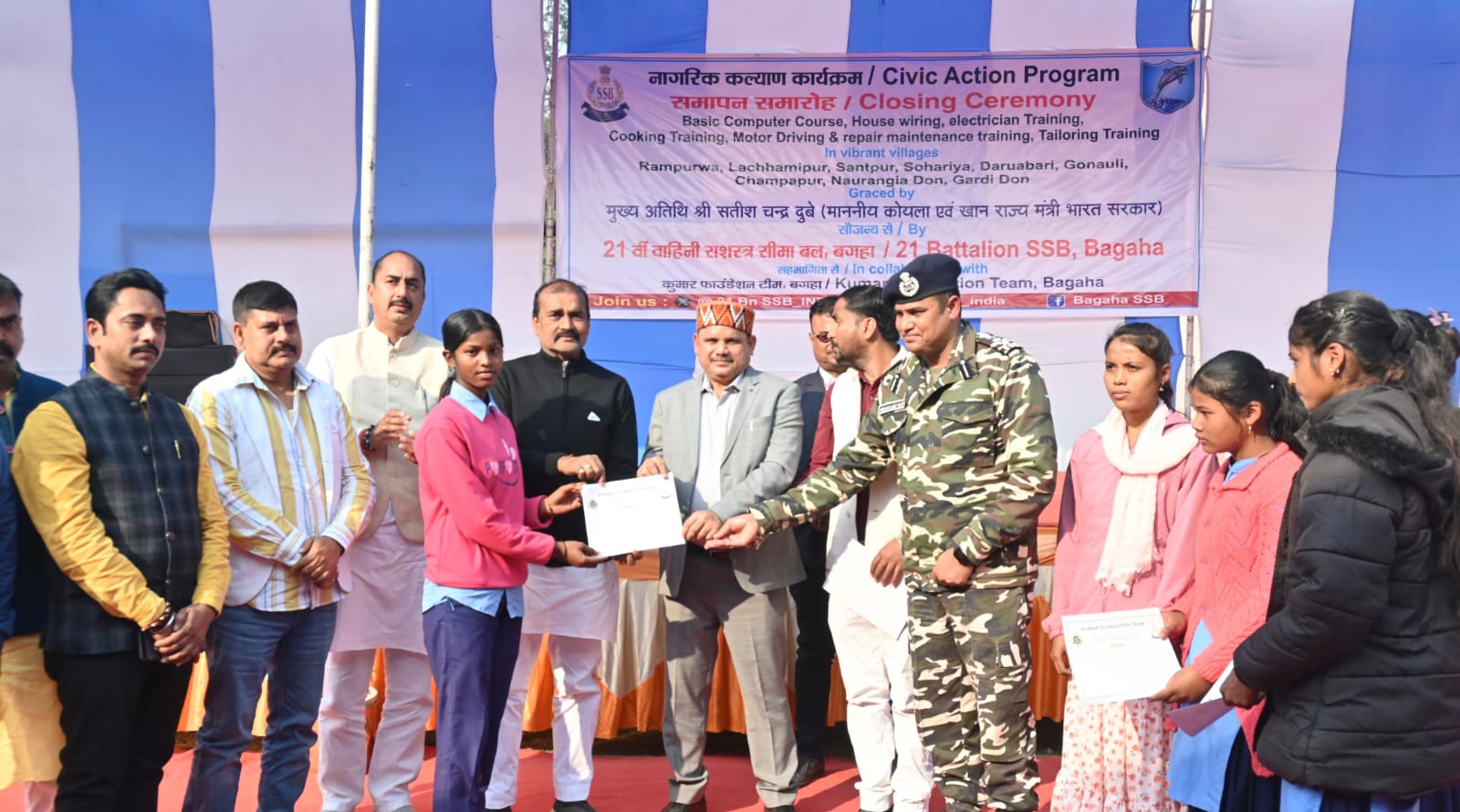 बेतिया/वाल्मीकिनगर:- वाल्मीकिनगर स्थित नदी घाटी योजना उच्चतर माध्यमिक विद्यालय प्रांगण में गुरुवार को एसएसबी 21 वीं वाहिनी बगहा द्वारा आयोजित नागरिक कल्याण कार्यक्रम समापन समारोह का भव्य आयोजन किया गया। इस कार्यक्रम के मुख्य अतिथि केंद्रीय कोयला एवं खान राज्य मंत्री सतीश चंद्र दुबे एवं वाल्मीकिनगर विधायक सुरेंद्र प्रसाद कुशवाहा रहे। कार्यक्रम की शुरुआत मुख्य अतिथि द्वारा दीप प्रज्वलित कर किया गया। बताते चलें कि एसएसबी 21वीं वाहिनी बगहा द्वारा कमांडेंट तपेश्वर संबित राउत के दूरदर्शी नेतृत्व से नागरिक कल्याण कार्यक्रम के तहत सीमावर्ती क्षेत्र के बेरोजगार व ज़रूरतमंद युवाओं एवं युवतियों हेतु बेसिक कंप्यूटर प्रशिक्षण, हाउस वायरिंग इलेक्ट्रीशियन प्रशिक्षण, कुकिंग प्रशिक्षण, मोटर चालक प्रशिक्षण, सिलाई प्रशिक्षण कार्यक्रम का समापन के साथ साथ जनमानस एवम् पशुओं की चिकित्सा हेतु मानव चिकित्सा शिविर एवं पशु चिकित्सा शिविर का आयोजन नदी घाटी योजना उच्चतर माध्यमिक विद्यालय परिसर में किया गया l