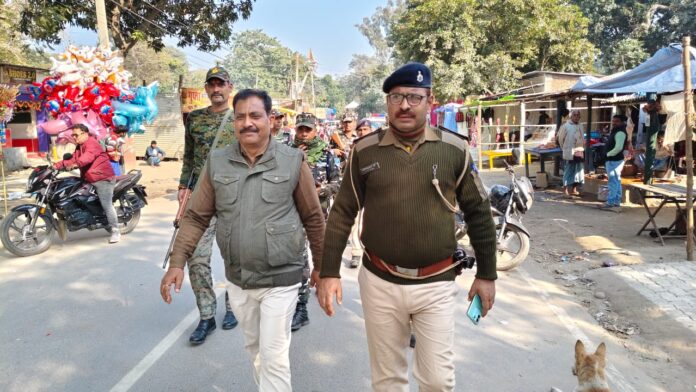 बेतिया/वाल्मीकिनगर:- माघ मौनी अमावस्या गंगा स्नान को लेकर वाल्मीकिनगर में प्रशासनिक स्तर से लगभग सभी तैयारियां पूरी कर ली गई है। शुक्रवार से ही श्रद्धालुओं का आना शुरू हो गया है। नारायणी से सटे प्रत्येक क्षेत्र में आज गंगा स्नान को लेकर श्रद्धालुओं ने डेरा जमा रखा है। शनिवार की सुबह से ही इंडो नेपाल बॉर्डर पर तैनात एसएसबी के जवानों एवं बिहार पुलिस के जवानों द्वारा भीड़भाड़ इलाकों में फ्लैग मार्च निकल लोगों को शांति एवं सौहार्दपूर्ण भाव से गंगा स्नान के लिए आने वाले श्रद्धालुओं की सुरक्षा में सहयोग करने की अपील की गई। इस फ्लैग मार्च का नेतृत्व स्वयं थानाध्यक्ष मुकेश चंद्र कुमर कर रहे थे। आने जाने वाले लोगों को परेशानी ना हो और ज्यादा भीड़ के कारण कोई अनहोनी ना हो इसको लेकर पुलिस प्रशासन द्वारा विशेष ध्यान दिया जा रहा है। मुख्य पथ से 10 फीट की दूरी पर व्यापारियों को दुकान लगाने का आदेश दिया गया है। धूप खिलने के कारण भीड़ अधिक होने की संभावना है। सबसे ज्यादा भीड़भाड़ वाले इलाके में पुलिस बल के जवानों को सादे लिबास में भी तैनाती की गई है।