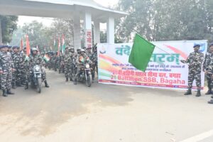 बेतिया/वाल्मीकिनगर:-‘वंदे मातरम्’ गीत के 150 वर्ष पूर्ण होने के ऐतिहासिक अवसर पर सशस्त्र सीमा बल की 21वीं वाहिनी, बगहा द्वारा देशभक्ति और जनसेवा से ओत-प्रोत भव्य कार्यक्रम का आयोजन किया गया। द्वितीय कमान अधिकारी सुरेश शर्मा, कार्यवाहक कमांडेंट के दूरदर्शी नेतृत्व में 21वीं वाहिनी बगहा से वाल्मीकिनगर तक एक प्रेरणादायी बाइक रैली निकाली गई। इस रैली का उद्देश्य सीमावर्ती क्षेत्रों में देशभक्ति की भावना को प्रबल करना तथा ‘वंदे मातरम्’ गीत के ऐतिहासिक और वैचारिक महत्व से जनमानस को अवगत कराना था। बाइक रैली के दौरान जवानों ने अनुशासन, एकता और राष्ट्रप्रेम का अद्भुत परिचय दिया। देशभक्ति नारों और ‘वंदे मातरम्’ के जयघोष से पूरा क्षेत्र गूंज उठा। रैली के वाल्मीकिनगर पहुंचने के बाद नदी घाटी योजना उच्च विद्यालय के प्रांगण में सांस्कृतिक एवं खेलकूद कार्यक्रमों का आयोजन किया गया। विद्यालय के छात्र-छात्राओं ने देशभक्ति गीत, नृत्य और अन्य सांस्कृतिक प्रस्तुतियों के माध्यम से उपस्थित जनसमूह को मंत्रमुग्ध कर दिया। खेलकूद प्रतियोगिताओं में नदी घाटी योजना उच्च विद्यालय की टीम ने उत्कृष्ट प्रदर्शन करते हुए विजेता का खिताब अपने नाम किया। कार्यक्रम के दौरान प्रतिभागी विद्यार्थियों का उत्साह देखते ही बनता था। एसएसबी की ओर से बच्चों को प्रोत्साहित करते हुए पुरस्कार भी प्रदान किए गए, जिससे उनमें आगे बढ़ने की प्रेरणा मिली।