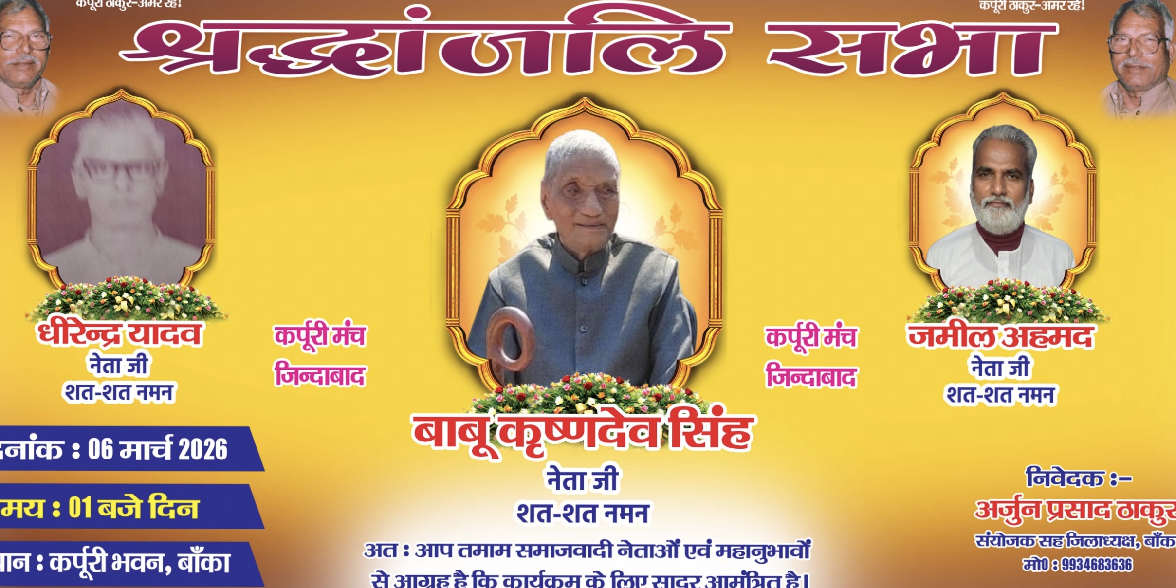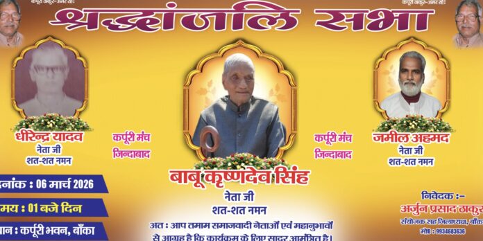 बिहार/बांका। बांका मुख्यालय समाहारनालय के समक्ष कर्पूरी भवण के प्रांगण में 6 मार्च को दिन के 01 बजे शुक्रवार को कर्पूरी विचार मंच के जिला संयोजक राजद के जिला अध्यक्ष अर्जुन ठाकुर के अध्यक्षता में जिले के तीन समाज वादियो का श्रद्धांजलि सभा आयोजित किया जा रहा है जिसमे फुल्लीडुमर प्रखंड अंतर्गत भितीया गांव निवासी स्वर्गीय कृष्ण देव सिंह, शंभूगंज प्रखंड बरोथा गांव निवासी धिरेन्द्र यादव एंव बांका प्रखंड के मलीक टोला निवासी ,जमील अहमद,साहेब का श्रद्धांजलि सभा आयोजित होने जा रहा है जिले के तमाम समाजवादियों से आह्वान किया गया है की कर्पूरी भवण बांका के पास पहुंचे और अपना अपना विचार इस समाजवादीयो के प्रति व्यक्त करें।