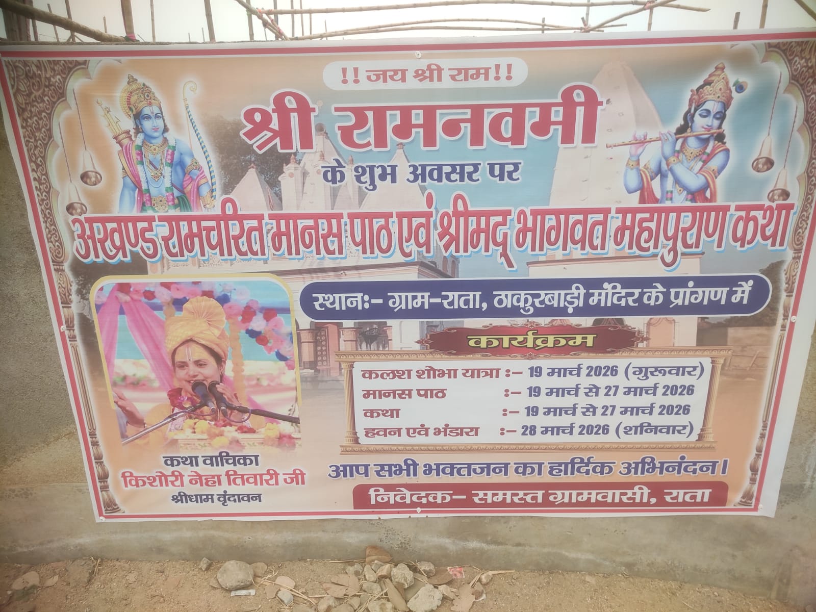 इसके साथ ही वापस कथा स्थल पर पहुंच कर ,भी कलश को रखा जायेगा इस कलश शोभा यात्रा के आगे आगे कथा वाचिका श्रीधाम वृन्दावन वासी किशोरी नेहा तिवारी जी के तथा रहेगें इसके साथ ही शोभा यात्रा को आकर्षित करने को लेकर घोड़ा धार्मिक गाने के साथ ध्वनिक विस्तारक यंत्र युवाओं की टोली के साथ साथ स्थानीय खेसर थाना के पुलिस प्रशासन मौजूद रहेंगे 28 मार्च 2026 शनिवार को हवन एवं भंडारन का कार्य किया जायेगा इस धार्मिक कार्य में राता गांव के संपूर्ण ग्राम बासियो के द्वारा ,संयोग प्रदान किया जा रहा है ।