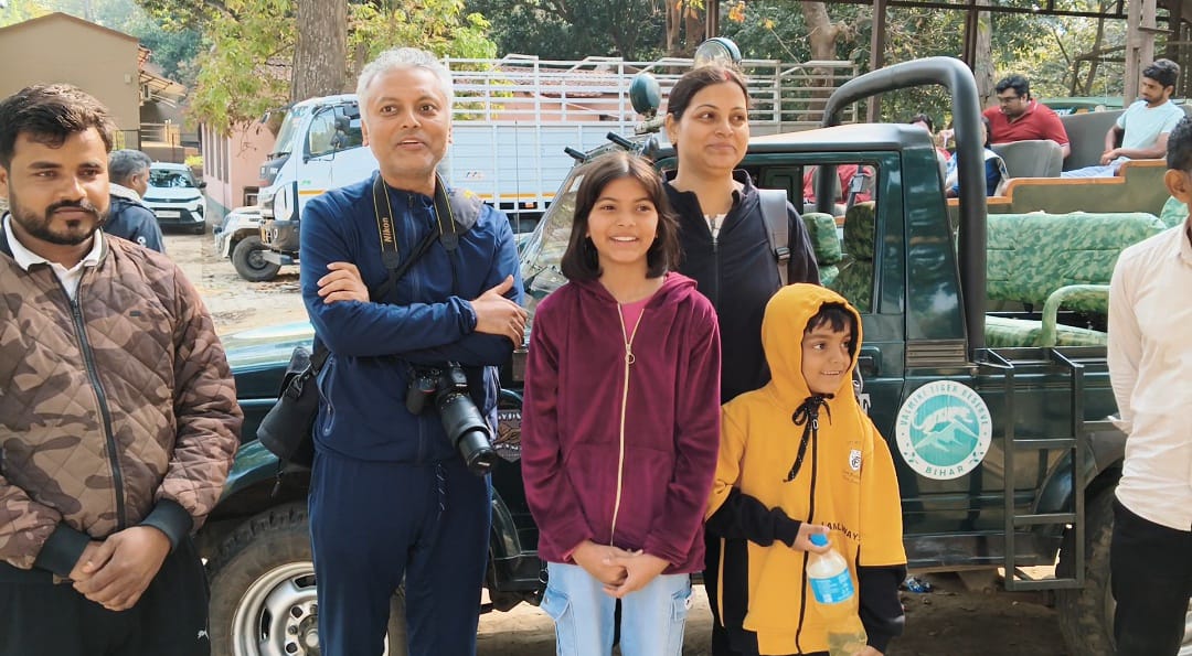 बेतिया/वाल्मीकिनगर: भारत-नेपाल सीमा पर स्थित वाल्मीकि टाइगर रिजर्व एक बार फिर पर्यटकों के लिए अविस्मरणीय अनुभव का गवाह बना, जब जंगल सफारी के दौरान “जंगल के राजा” बंगाल टाइगर ने सामने आकर सभी को रोमांचित कर दिया। उत्तर प्रदेश के गोरखपुर से आए एक डॉक्टर परिवार के लिए यह सफर जीवन का सबसे यादगार पल बन गया, वहीं बच्चों की खुशी देखते ही बन रही थी। शनिवार की सुबह जंगल सफारी के दौरान मोटर अड्डा जंगल क्षेत्र के समीप पर्यटकों को बाघ के दर्शन हुए। खास बात यह रही कि बाघ कुछ देर तक खुले इलाके में विचरण करता रहा, जिससे पर्यटकों को उसका स्पष्ट और शांत स्वरूप देखने का अवसर मिला। बाघ बेहद धीमी और आत्मविश्वास भरी चाल से अपने रास्ते पर आगे बढ़ रहा था, मानो वह जंगल का निरीक्षण कर रहा हो। इस दौरान सफारी में मौजूद पर्यटक अपने मोबाइल और कैमरों से इस अद्भुत क्षण को कैद करने में जुटे रहे। सफारी में शामिल गोरखपुर के डॉ. रजनीश पांडेय, उनकी पत्नी डॉ. अभिलाषा और बेटी मुक्ता ने अपनी खुशी साझा करते हुए कहा, “हमारी दिली इच्छा थी कि बाघ का दीदार हो, और आज वह पूरी हो गई। हमारी बेटी की खुशी का ठिकाना नहीं रहा। यह अनुभव जीवनभर याद रहेगा।” परिवार ने बताया कि जंगल की हरियाली, पक्षियों की मधुर आवाज और बाघ की शाही मौजूदगी ने पूरे माहौल को रोमांच और सुकून से भर दिया।