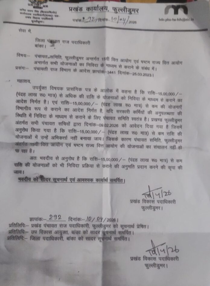 बिहार/बांका। बांका जिले के फूललीडुमर प्रखंड के कार्यपालक पदाधिकारी पंचायत समिति सह प्रखंड विकास पदाधिकारी अमित प्रताप सिंह के द्वारा जिला पंचायत राज पदाधिकारी बांका को एक पत्र जारी करते हुए पंचायत समिति फुली डूमर अंतर्गत 15 में वित्त आयोग एवं षष्ठम राज्य वित्त आयोग अंतर्गत सभी योजनाओं का निविदा के माध्यम से करने को लेकर कहा गया है इन्होंने पत्र के माध्यम से 15 लाख से अधिक की राशि की योजनाओं को निविदा के माध्यम से करने का आदेश निर्गत किया है एवं 15 लाख से काम की योजनाओं को विभागीय रूप से करने का आदेश दिया है इन्होंने पत्र में यह भी दर्शाया है कि प्रखंड के सभी पंचायत सचिवों द्वारा 9 फरवरी 2026 को एक आवेदन दिया गया था जिसमें अनुरोध किया गया था कि 15 लाख रुपए मात्र से कम राशि की योजनाओं में उन्हें अभिकर्ता नहीं बनाया जाए जिसके कारण पंचायत समिति फुली डूमर अंतर्गत 15वीं वित्त आयोग एवं सिस्टम राज्य वित्त आयोग की योजनाओं का संचालन नहीं हो पा रहा है इतना ही नहीं अनुरोध भी किया गया था कि 15 लख रुपए मात्र से कम राशि की योजनाओं को भी निविदा प्रक्रिया से करने की अनुमति प्रदान करने की कृपा की जाए इसको लेकर कार्यपालक पदाधिकारी पंचायत समिति सह प्रखंड विकास पदाधिकारी अमित प्रताप सिंह के द्वारा प्रखंड पंचायत राज पदाधिकारी फुली डूमर उप विकास आयुक्त बांका एवं जिला पदाधिकारी महोदय बांका को सादर सुचना अर्थ पत्र समर्पित कर दिया गया है।