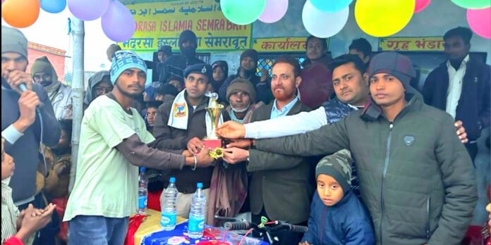 बेतिया/मझौलिया। मझौलिया प्रखंड क्षेत्र के नौतन खुर्द पंचायत स्थित सेमरा वृत्त में आयोजित पांच दिवसीय सर्किल क्रिकेट टूर्नामेंट का रोमांचक फाइनल मुकाबला अरनहवा क्रिकेट टीम और सेमरा वृत्त क्रिकेट टीम के बीच खेला गया। टॉस जीतकर बैटिंग करने उतरी अरनहवा की टीम ने निर्धारित ओवरों में 89 रन का स्कोर खड़ा किया। लक्ष्य का पीछा करने उतरी सेमरा वृत्त क्रिकेट टीम मात्र 62 रन पर ऑल आउट हो गई। जिससे 27 रनों से हार का सामना करना पड़ा। विजेता टीम को ट्राफी देते हुए प्रसिद्ध चिकित्सक डॉक्टर साबिर अली ने कहा कि सामाजिक समरसता कायम रखना है खेलकूद। जीवन में पठन-पाठन के साथ-साथ खेलकूद भी आवश्यक है। खेल समाज में एकता भाईचारा और सांप्रदायिक सौहार्द कायम करता है।